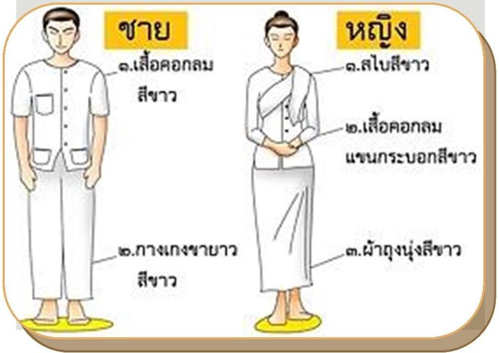 ๒. แต่งกายสุภาพ (ผู้ปฏิบัติธรรมชายสวมชุดกางเกงขายาวสีขาว, ผู้ปฏิบัติธรรมหญิงสวมชุดผ้านุ่งสีขาวและห่มผ้าสไบ)