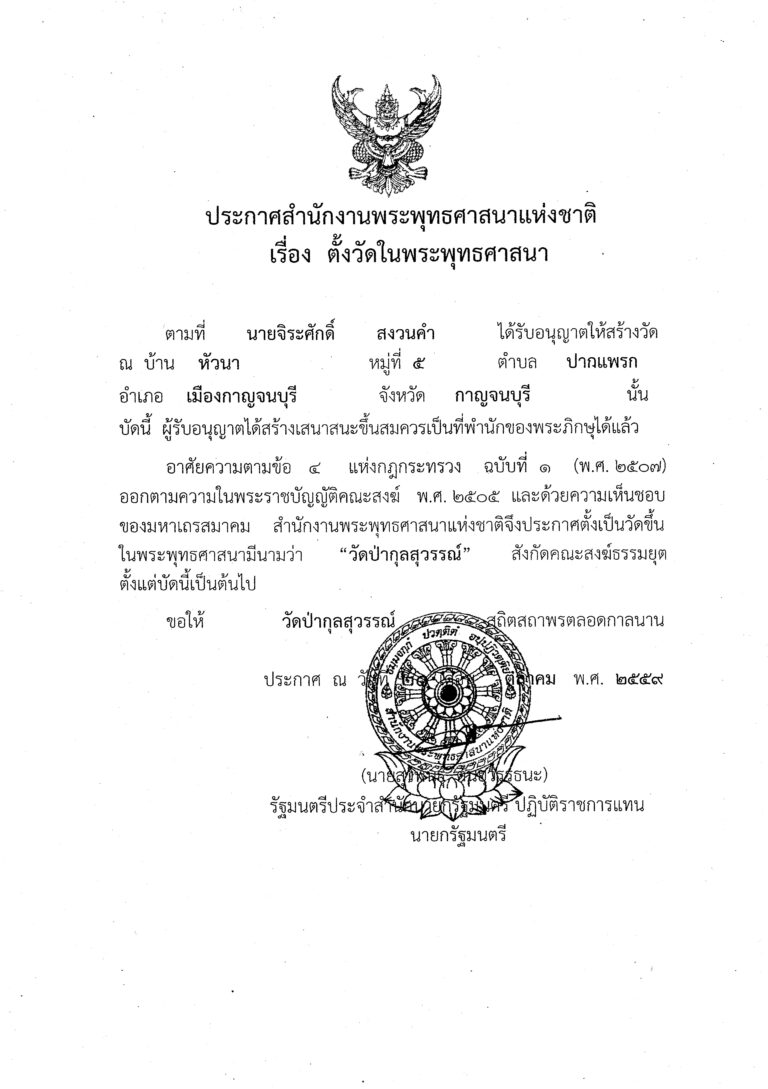 เมื่อช่วงเดือนตุลาคม ปีพ.ศ.๒๕๕๕ คุณจำนงค์ กุลสุวรรณ์ พร้อมด้วยนางบุญมี กุลสุวรรณ์ ภรรยา ได้มีเจตนานำที่ดินจำนวน ๑๐ ไร่ ถวายไว้ในพระพุทธศาสนาซึ่งที่ดินดังกล่าวตั้งอยู่ใน ซอยหัวนาบน๒/๓ หมู่๕ ต.ปากแพรก อ.เมือง จ.กาญจนบุรี ซึ่งท่านได้พิจารณาเห็นควรรับไว้ เพื่อเป็นประโยชน์แก่หมู่พระเณร ที่ต้องเดินทางมาจากที่ต่างจังหวัด จะได้มีที่พัก หรือเวลามีกิจธุระจำเป็น ที่ในตัวจังหวัด อีกทั้งจะได้เป็นสถานที่ปฏิบัติธรรม ของชาวเมืองกาญจนบุรี อีกแห่งหนึ่งด้วย