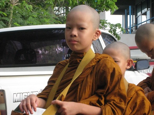 จีนเล่าให้ผมฟังว่า “แรกๆ ก็ลำบากหน่อยครับ ต้องถูกปลุกให้ตื่นตั้งแต่ตี ๔ กว่า เพื่อนๆ ที่บวชอยู่ด้วยกันจำนวนมากไม่ยอมตื่น ต้องโดนดุอยู่บ่อยๆ จัดของเสร็จแล้วต้องขึ้นไปทำวัตรเช้า แล้วจึงออกบิณฑบาตรอบสระน้ำ จีนต้องรีบตื่นตามเสียงปลุกของครูบา บางครั้ง ไม่ได้แปรงฟันเป็นเวลาหลายวัน น้ำก็ไม่ได้อาบ จีนเล่าให้ฟังต่ออย่างเหนียมอายว่า ๓ วันแรกคิดถึงบ้านมาก เพราะไม่เคยห่างบ้านครับ แม่ผมอยากให้ผมบวชเณรในระหว่างปิดเทอม ผมก็คิดว่าดีครับ จึงมาบวชตามที่คุณแม่แนะนำ พอมาอยู่วัด แรกๆ อยากกลับบ้าน มองไปที่ไหนตอนเย็นๆ เห็นแต่เณรเต็มไปหมด ที่นอนก็แข็ง มีเสื่อกับผ้าปูนอนเท่านั้น ไม่เหมือนบ้าน จึงปรับตัวไม่ได้ ต้องใช้เวลา ๒-๓ วัน จึงค่อยคุ้นเคย”